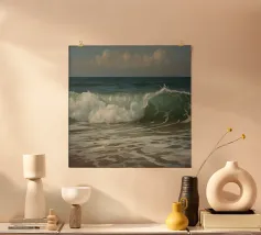 This oil painting captures the power and beauty of offshore waves. Towering swells rise and surge, rendered in bold strokes of deep blue, sea green, and foamy white, creating striking contrasts. Sunlight reflects off the ocean’s surface, shimmering and ever-shifting. The painting evokes a sense of freedom, the majesty of nature, and the boundless energy of the sea.