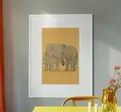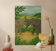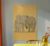 Bringen Sie Wärme und sanften Charme in das Zimmer Ihres Kindes mit dieser entzückenden Illustration von zwei liebenden Elefanten. Dieses Kunstwerk ist perfekt für ein modernes Kinderzimmer geeignet. Es zeichnet sich durch weiche Texturen, warme Erdtöne und eine herzerwärmende Verbindung zwischen den Elefanten aus und ist somit ideal für Babyzimmer, Spielzimmer oder als Geschenk zur Babyparty. Es ist in einer skurrilen und friedlichen Ästhetik gestaltet und passt zu jeder minimalistischen oder safarimäßigen Einrichtung.