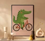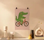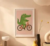 Verleihen Sie dem Zimmer Ihres Kindes einen skurrilen Touch mit dieser bezaubernden digitalen Illustration eines lächelnden Krokodils, das auf einem roten Fahrrad fährt. Vor einem zartrosa Hintergrund und in einem warmen, verspielten Stil gestaltet, bringt dieses Kunstwerk Charme und Freude in jedes Kinderzimmer, Kleinkindzimmer oder Spielzimmer.