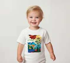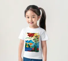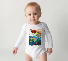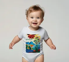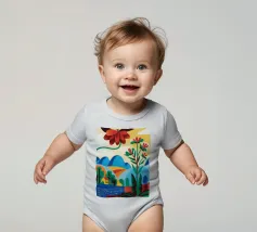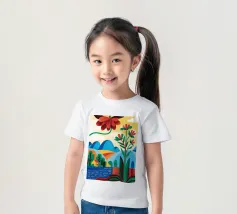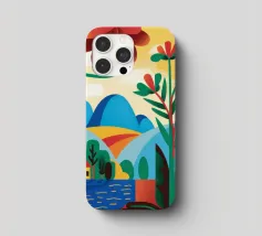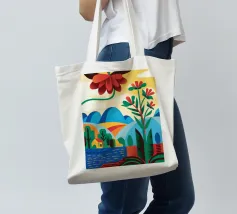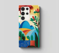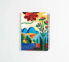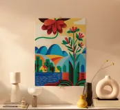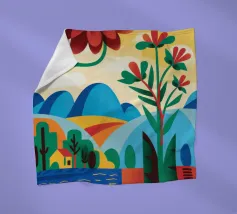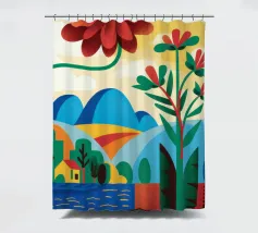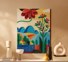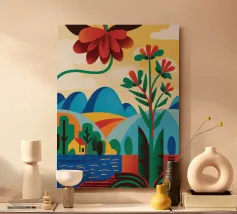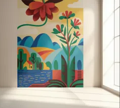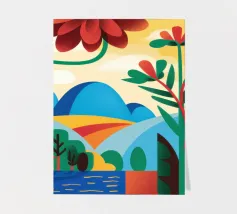 A whimsical, folk art style landscape with rolling blue hills, stylized trees, and a giant red flower in the foreground.