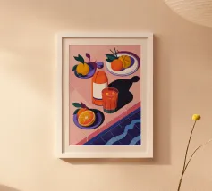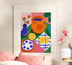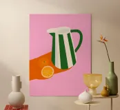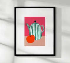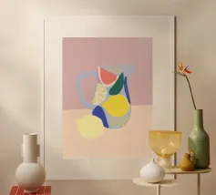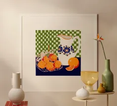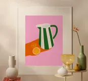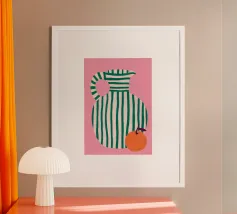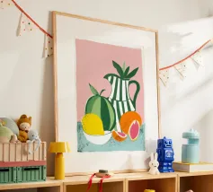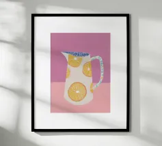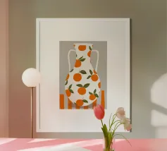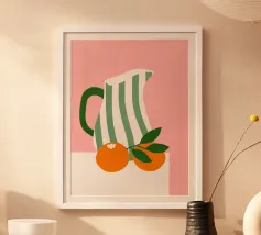 Dieser minimalistische Wasserkrug in sanften Weiß-, Grün- und Pinktönen, dekoriert mit frischen Orangen, bringt sommerliche Frische und skandinavisches Design in jede Küche.