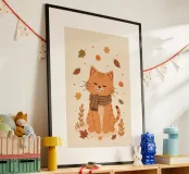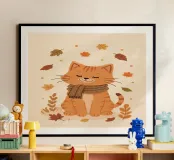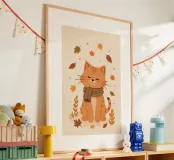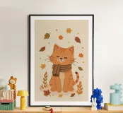 Orangefarbene Katze mit Halstuch und Herbstblättern Poster