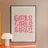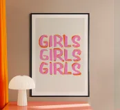 Das Bild zeigt ein Design im Pop-Art-Stil mit dem Wort „GIRLS“, das dreimal in fetten, verspielten Buchstaben wiederholt wird. Der Text ist in einem leuchtenden Pink mit einer dicken, orangefarbenen Umrandung gehalten, was einen lebendigen und auffälligen Kontrast schafft. Die Wörter sind in einem vertikalen Stapel vor einem schlichten weißen Hintergrund angeordnet, was die lebhaften Farben und den dynamischen Stil des Textes unterstreicht. Die Gesamtästhetik ist lustig und energiegeladen und spiegelt eine moderne und jugendliche Stimmung wider.