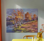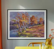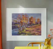 Ein Landschaftsgemälde, das einen Birkenhain mit goldenem Herbstlaub an einem ruhigen Gewässer zeigt. Der Himmel ist von einem weichen, dunstigen Blau.