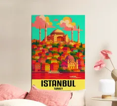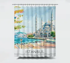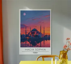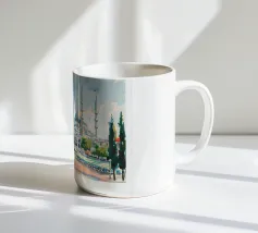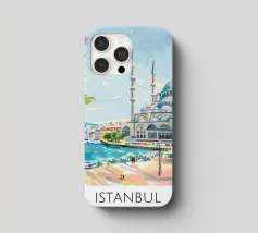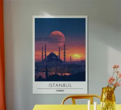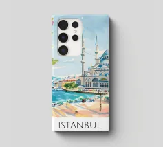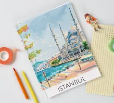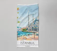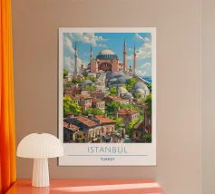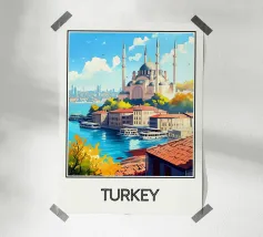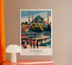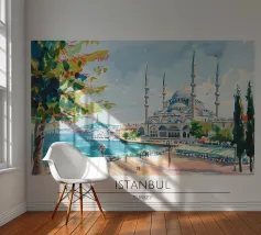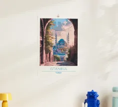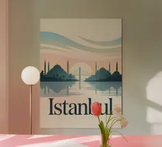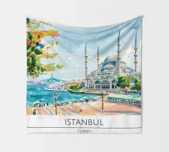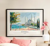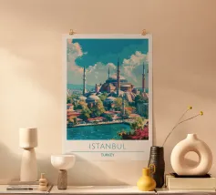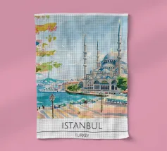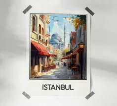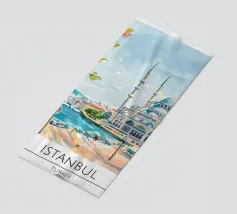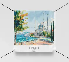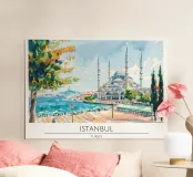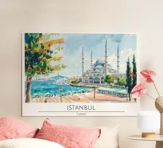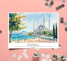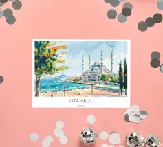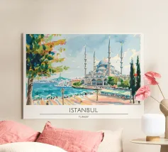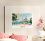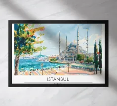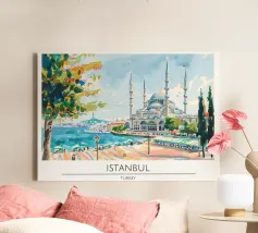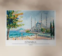 Dieses atemberaubende Poster im Aquarellstil zeigt die berühmte Sultan-Ahmed-Moschee, auch bekannt als Blaue Moschee, mit Blick auf den glitzernden Bosporus. Die leuchtenden Farben und fließenden Pinselstriche vermitteln ein Gefühl von Wärme und Bewegung und erwecken das geschäftige Hafenviertel von Istanbul zum Leben. Die Szene wird von üppigen Bäumen umrahmt und zeigt Menschen, die entlang der Promenade flanieren, während im Hintergrund eine Fähre das Meer überquert. Dieses hochwertige digitale Poster (7000x5000 Pixel, 300 dpi) ist ein meisterhaftes Kunstwerk, das die reiche Geschichte und die wunderschöne Landschaft Istanbuls verkörpert.
