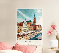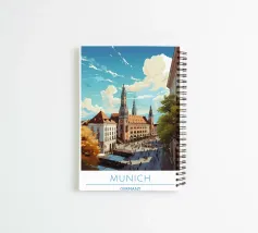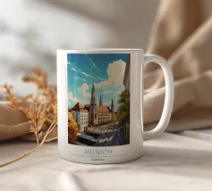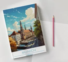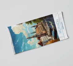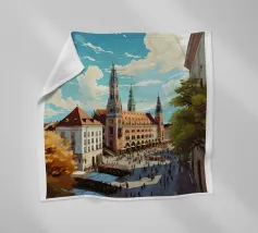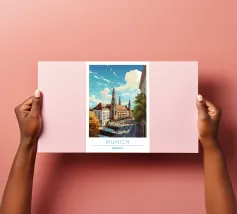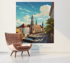 Entdecken Sie das Herz Bayerns mit diesem lebendigen Reiseposter von München, Deutschland. Das Kunstwerk zeigt das prächtige Alte Rathaus oder Neue Rathaus, das prominent über einem belebten Platz steht, wahrscheinlich dem Marienplatz. Die Architektur zeigt beeindruckende Elemente der Neogotik oder der Renaissance, mit hoch aufragenden Türmen und gewölbten Fassaden. Der Platz ist voller Menschen, die den sonnigen Tag unter einem dramatischen, wolkengefüllten blauen Himmel genießen. Dieses hochwertige digitale Poster (7000x5000 Pixel, 300 dpi) verwendet einen reichhaltigen, grafischen Illustrationsstil, der die historische Pracht einfängt