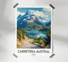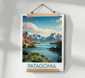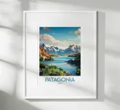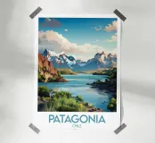 This poster of Chilean Patagonia reveals a majestic landscape of snow-capped peaks, turquoise lakes and raw nature. A visual masterpiece for a wall decoration that evokes adventure, escape and the grandeur of the southern lands.
