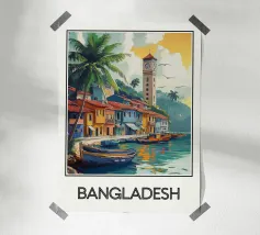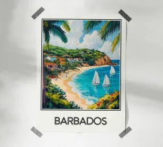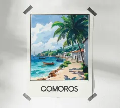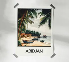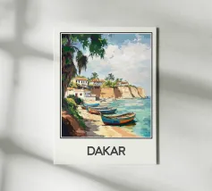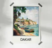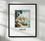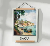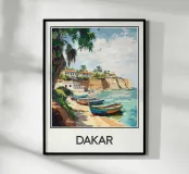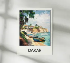 Immerse yourself in the sunny atmosphere of Dakar with this magnificent travel poster. A beach lined with colourful pirogues, golden cliffs and a turquoise sea capture all the beauty and authenticity of Senegal. An ideal wall decoration for an exotic, maritime touch.