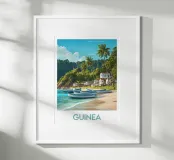 An illustration of a fishing village in Guinea, with boats lining the beach, majestic palm trees and a lighthouse overlooking the scene. A peaceful, tropical view ideal for an exotic wall decoration.