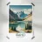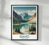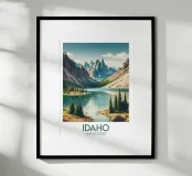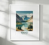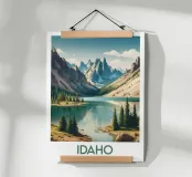 Illustrated poster from Idaho depicting a peaceful mountain lake surrounded by fir trees and majestic peaks. An ideal wall decoration for creating a natural, calm and inspiring atmosphere.
