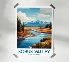 Illustration des Wrangell-St. Elias Nationalparks mit majestätischen, schneebedeckten Bergen, die ein grünes Tal und einen Gletscherfluss überblicken. Ein perfektes Wandposter für alle, die sich für Wildnis, Berge und ferne Abenteuer begeistern.