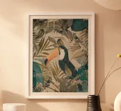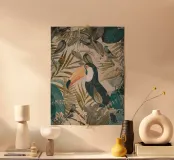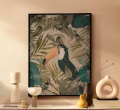 Exotischer Tukan-Vogel und tropische Dschungelvegetation. Perfekt für Naturliebhaber, Reisende und Abenteurer, die den Vintage-Stadtdschungel-Look mögen