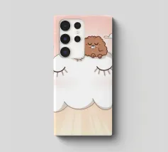 Dieses Kunstwerk zeigt eine mürrisch aussehende Wolke mit einer Gedankenblase, die einen Vogel und einen Bären enthält. Die humorvolle und fantasievolle Szene ist vor einem sanften blauen Hintergrund zu sehen.