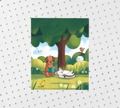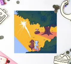Dieses Kunstwerk zeigt eine mürrisch aussehende Wolke mit einer Gedankenblase, die einen Vogel und einen Bären enthält. Die humorvolle und fantasievolle Szene ist vor einem sanften blauen Hintergrund zu sehen.