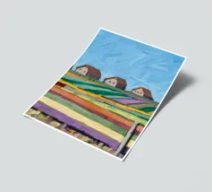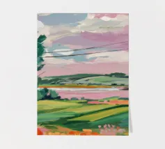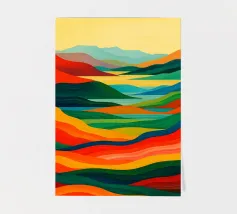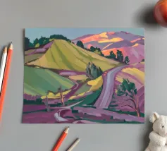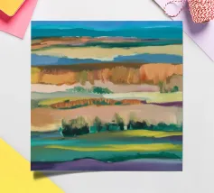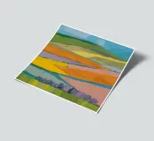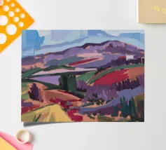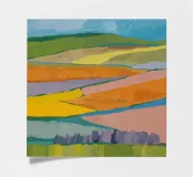 Ein malerischer Blick auf hügelige Patchwork-Felder, die in kräftigen Pastelltönen gehalten sind und eine traumhafte Landschaft schaffen.