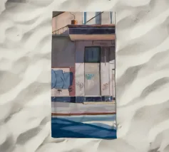 Die strenge Geometrie eines überdachten Gehwegs wird durch kühne karminrote Säulen und die langen, scharfen Schatten, die sie im hellen Sonnenlicht werfen, bestimmt. Dieses Gemälde ist eine kraftvolle Studie von Licht, Schatten, Farbe und architektonischer Form.