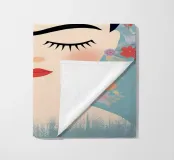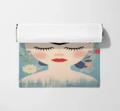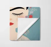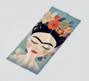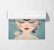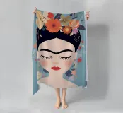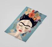 Digitales Porträt Malerei von Frida Kahlo im Boho-Stil begeistert mit floralen pastel Elementen und leuchtenden Farben wie hellblau, Rosa und Gelb, die ihre ikonischen Merkmale wunderbar zur Geltung bringen. Perfekt für moderne Inneneinrichtungen oder Kinderzimmer, verkörpert es die Schönheit der Modernen Graphic Kunst und inspiriert zugleich.