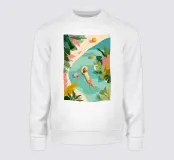 Das Sonnenlicht dringt durch tropische Blätter, während sie friedlich in einem Pool schwimmt und sich völlig entspannt. Die Welt um sie herum verschwindet in sanften Farben und ruhigen Formen - Strandbälle, Sandalen und die Zeit selbst bleiben zurück. Dieses Werk ist ein visuelles Aufatmen und eine Erinnerung daran, innezuhalten, zu atmen und die Ruhe zu genießen.