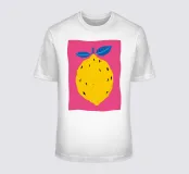 Eine große, einzelne gelbe Zitrone, illustriert mit einem strukturierten, düsteren Stil vor einem leuchtend rosa Hintergrund. Das Werk ist eine kühne, moderne und grafische Pop-Art-Interpretation einer klassischen Frucht.