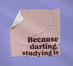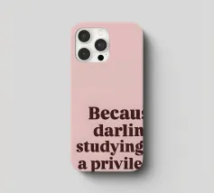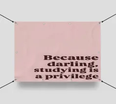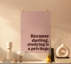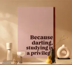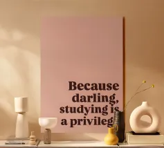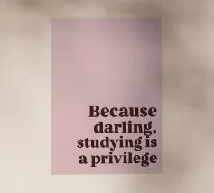 "Der Satz 'Because darling, studying is a privilege' ist in einer fetten, dunkelbraunen Serifenschrift auf einem zartrosa Hintergrund dargestellt."