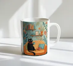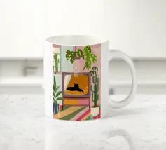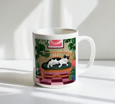 Eine charmante und gemütliche Illustration einer schwarz-weißen "Smoking"-Katze, die friedlich auf einem gelben Sofa schläft, umgeben von Topfpflanzen. Das Kunstwerk fängt die einfache, ruhige Freude eines Katzenschlafs ein.