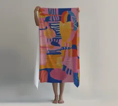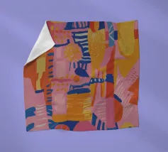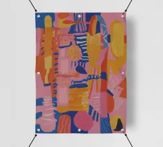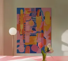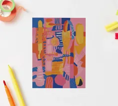 Eine raffinierte abstrakte Komposition mit einem Patchwork aus geometrischen und organischen Formen in einer gedämpften Pastellpalette. Das Werk hat eine ruhige, ausgewogene Ausstrahlung mit einer subtilen, strukturierten Qualität.
