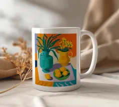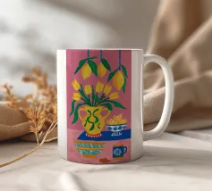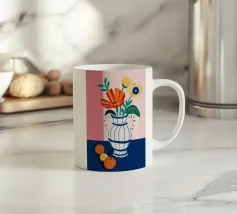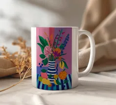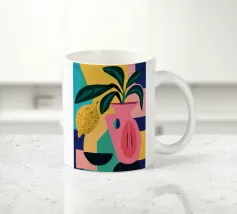 Ein farbenfroher Strauß aus Blumen und Zitrusfrüchten steht in einer blauen Vase auf einem rosa Tisch. Der Hintergrund ist eine dynamische Mischung aus schwarzen und weißen Zickzackmustern und grünen Blättern, die ein verspieltes, modernes Stillleben ergeben.