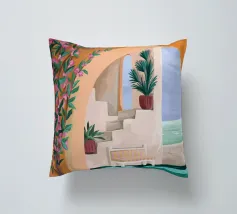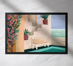 Eine tropische Illustration in einer mediterranen Umgebung. Die Bank lädt zum Träumen in dieser sommerlichen Umgebung ein.