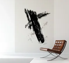 Modernes abstraktes Kunstwerk mit organischen Formen und Linien und schwarzen Pinselstrichen, die eine warme Atmosphäre in Ihrem Interieur schaffen. Das Kunstwerk hat einen beigen Hintergrund, der einen zeitlosen Look hat. Dieses minimalistische Kunstwerk passt gut in einen modernen, einfachen, böhmischen und industriellen Wohnstil. Wenn Sie es einfach und elegant mögen. Geeignet für ein modernes Wohnzimmer, Schlafzimmer, Flur und Büro.