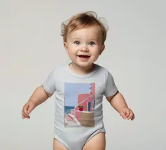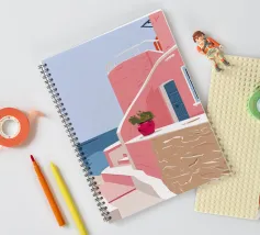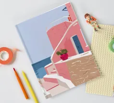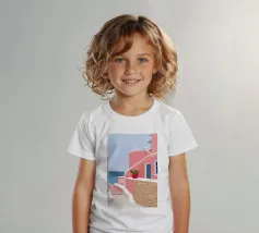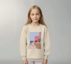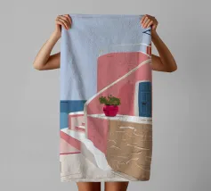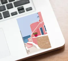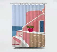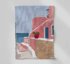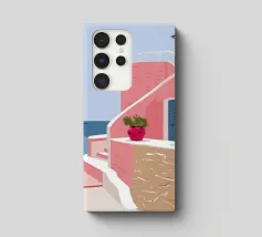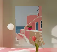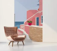 Eine klassische mediterrane Szene, die ein rosafarbenes Gebäude mit einer Treppe zeigt, die hinunter zu einem ruhigen blauen Meer führt. Dieses Kunstwerk fängt den sonnenverwöhnten, friedlichen Reiz einer griechischen Inselreise perfekt ein.