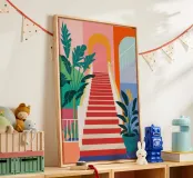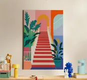 Eine leuchtend rote Treppe führt durch ein farbenfrohes, vereinfachtes Gebäude hinauf zu einem üppigen, gewölbten Eingangsbereich, der eine Reise zu einem schönen und exotischen Ziel suggeriert.