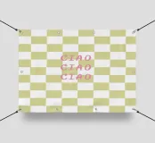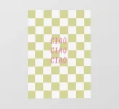 ciao ciao ciao Schriftzug auf Pistazien farbendem check Muster.
