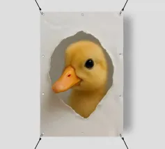 Ein niedliches Entenküken lugt unter einem weichen weißen Handtuch hervor. Seine flauschigen gelben Federn und seine neugierigen Augen schaffen eine bezaubernde und charmante Szene.