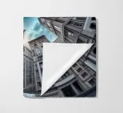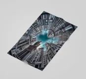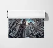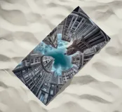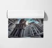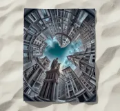 Dieses Bild zeigt eine beeindruckende kreisförmige architektonische Anordnung mit hohen, modernisierten klassischen Gebäuden, die zum Himmel hin konvergieren. Eine prominente Statue in der Mitte verstärkt die dramatische Perspektive unter einem wolkenverhangenen blauen Himmel.