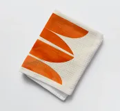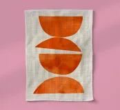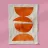 Ein abstraktes Kunstwerk mit kräftigen orangefarbenen Halbkreisformen, die vertikal auf einem hellen Hintergrund gestapelt sind.