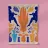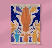 Eine abstrakte Komposition mit zwei großen, stilisierten Händen in Blau und Orange, umgeben von Vasen, Blättern und anderen organischen Formen.
