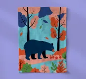 Genießen Sie die natürliche Schönheit eines herbstlichen Waldes mit dieser Illustration eines Bären, der auf Futtersuche ist. Warme Farben und ein minimalistisches Design schaffen eine friedliche und beruhigende Atmosphäre.