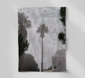Fotografie einer hohen Palme und einer kleinen Möwe auf Gebäude