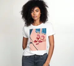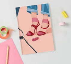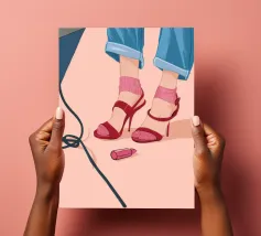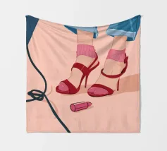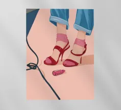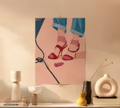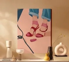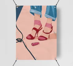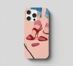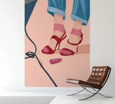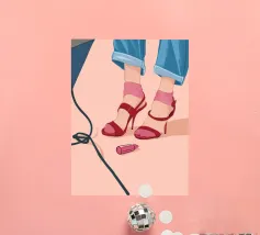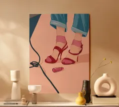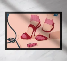 Eine Nahaufnahme, niedrigen Winkel Mode Illustration einer Person Füße tragen stilvolle rosa oder fuchsia Fersen, mit einem fallengelassenen Lippenstift auf dem Boden einen Hauch von Erzählung hinzufügen.