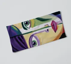 Dieses Gemälde zeigt eine Maske mit kräftigen Farben und abstrakten Formen. Die Komposition enthält geometrische Muster, die ein dynamisches und energiegeladenes visuelles Erlebnis schaffen.