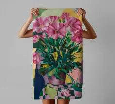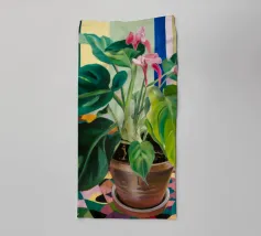 Dieses Kunstwerk zeigt eine Pflanze mit langen grünen Blättern und rosa Blüten. Der Hintergrund besteht aus abstrakten Formen in Rosa und Grün, die dem botanischen Thema einen Hauch von Eleganz verleihen.