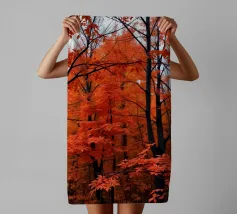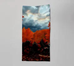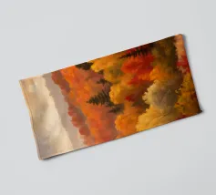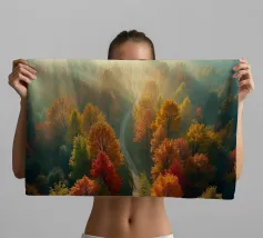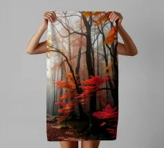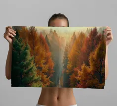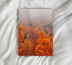 Bunte Bäume in Orange-, Rot- und Gelbtönen füllen den Wald, während der Nebel tief hängt und eine heitere und malerische Herbstkulisse schafft.