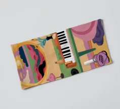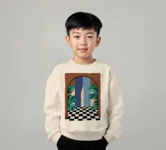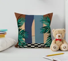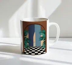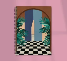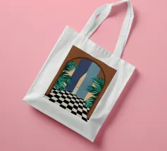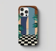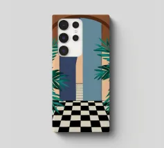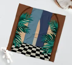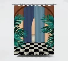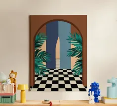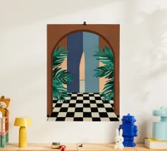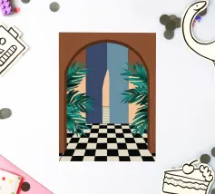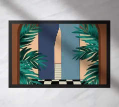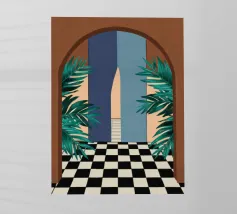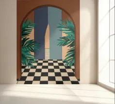 Eine Illustration eines gewölbten Tores mit einem karierten Boden, der den Blick auf ein üppiges tropisches Paradies mit Palmen freigibt. Die Szene ist ein einladender und geheimnisvoller Einblick in eine schöne Flucht.