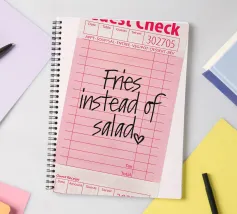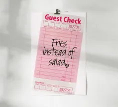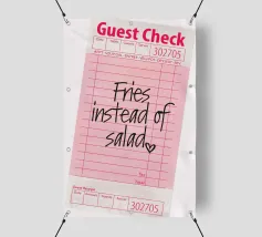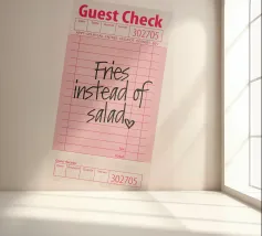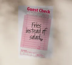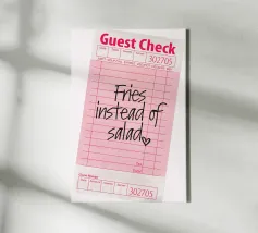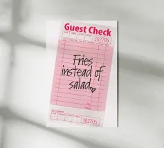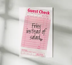 Das Bild zeigt eine rosafarbene Gästekarte, wie sie in Restaurants verwendet wird, mit handgeschriebenem Text, der lautet „Pommes statt Salat“, gefolgt von einem kleinen Herzsymbol. Die Gästekarte hat das typische Layout mit Feldern für Artikelbeschreibungen, Mengenangaben und Preise, aber diese Felder sind bis auf die verspielte handschriftliche Notiz leer gelassen. Die Gesamtkomposition hat einen ungezwungenen und humorvollen Ton, der auf eine unbeschwerte Vorliebe für bequemes Essen gegenüber einer gesünderen Option hindeutet.