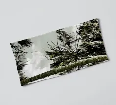 Botanische grüne Palmen in einer Reihe. Fünf Bäume in einer Reihe am Strand in Kalabrien. Wind, Wolken an einem dunklen Tag im Sommer in Italien.