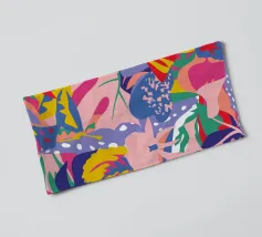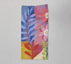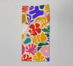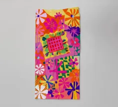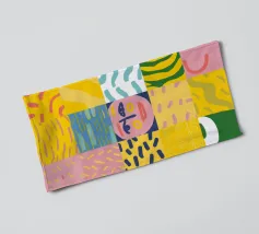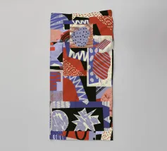 Ein abstraktes Muster kombiniert patchworkartige Farbblöcke mit energiegeladenen Kritzeleien und Streifen und schafft so ein dynamisches, verspieltes und künstlerisches Design.