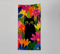 Ein wunderschönes Porträt einer schwarz-weiß getigerten Katze mit intensiven Augen, eingerahmt von leuchtend roten Tulpen. Das Kunstwerk ist eine eindrucksvolle und elegante Hommage an ein geliebtes Haustier.