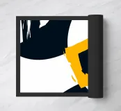 Kühne schwarze Kurven verflechten sich mit einem leuchtenden goldenen Quadrat in der Mitte und schaffen eine dynamische und abstrakte Komposition. Das Zusammenspiel von dunklen und hellen Kontrasten verleiht dem Design Tiefe und Bewegung.