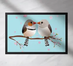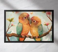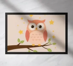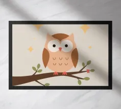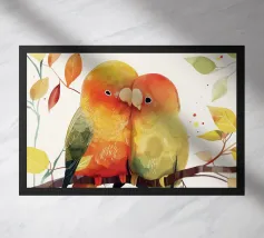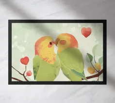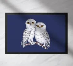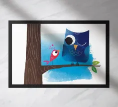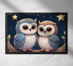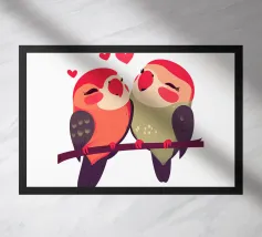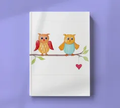 Freundlich mit Aquarellfarben gemalte Eulen auf einem Zweig mit angehängtem Herz.