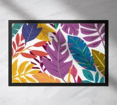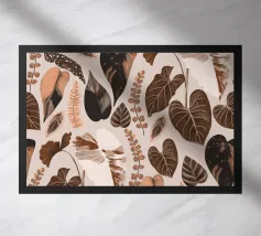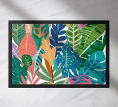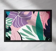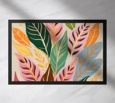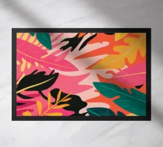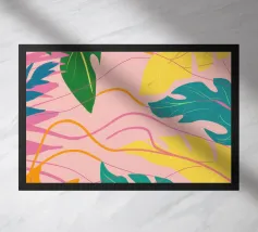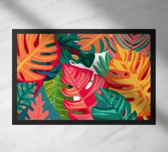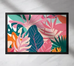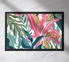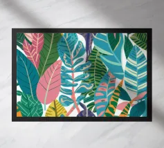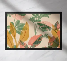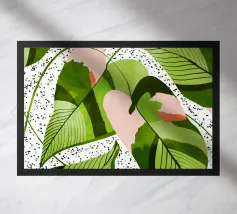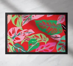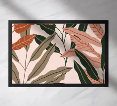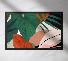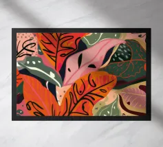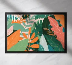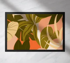 Dieses lebendige Kunstwerk zeigt eine dynamische Komposition aus tropischen Blättern in kräftigen, kontrastreichen Farben. Das Werk zeigt eine Mischung aus tiefgrünem, zartrosa und leuchtend orangefarbenem Blattwerk mit komplizierten Adermustern, die Textur und Details hinzufügen. Das Zusammenspiel von warmen und kühlen Tönen sorgt für ein lebendiges, energiegeladenes Gefühl, während der klare, cremefarbene Hintergrund die Blätter gut zur Geltung kommen lässt. Der stilisierte, grafische Ansatz verleiht dem Kunstwerk eine moderne und verspielte Ästhetik, die die üppige Schönheit der Natur in einem zeitgemäßen Design hervorruft.
